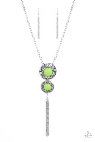 Stamped in vein-like patterns, two oversized silver discs are dotted with bubbly green beaded centers at the bottom of a chunky silver chain. A shimmery silver chain tassel swings from the bottom of the stacked pendant, adding playful movement. Features an adjustable clasp closure. Features an adjustable clasp closure.