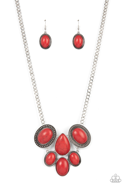 Featuring an assortment of studded, textured, and smooth silver frames, a fiery combination of oversized oval and teardrop Fire Whirl stones links into an exaggerated earthy pendant below the collar for an artisan inspired fashion. Features an adjustable clasp closure.