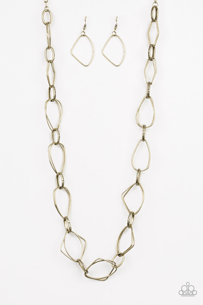 Varying in size, mismatched brass frames connect across the chest for an edgy look. Features an adjustable clasp closure.