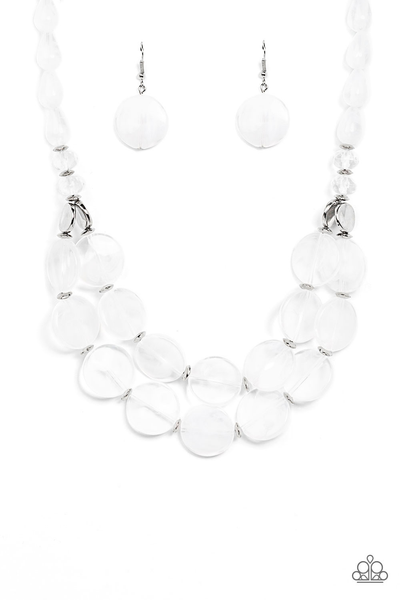 Intermixed with glassy crystal-like beads and shiny silver accents, mismatched cloudy, glassy, and opaque white teardrop and disc beads layer below the collar for a classic pop of neutral color. Features an adjustable clasp closure.