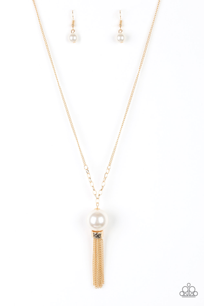A dramatic pearly white bead swings from the bottom of an elegantly elongated gold chain. Featuring a hammered fitting, a gold tassel streams from the bottom of the colorful pendant for a refined finish. Features an adjustable clasp closure.