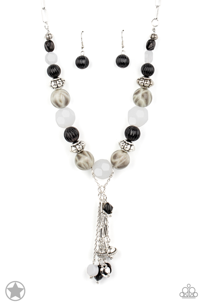Smooth beads with a marbleized black and white swirl alternate with milky white and silver accents. A tassel of chains in various lengths is decorated with black, silver, and frosty pieces. Features an adjustable clasp closure.