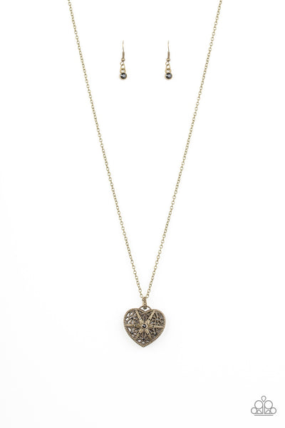 Encrusted in glittery black rhinestones, a vintage inspired heart pendant swings from the bottom of a shimmery brass chain for a romantic fashion. Features an adjustable clasp closure.