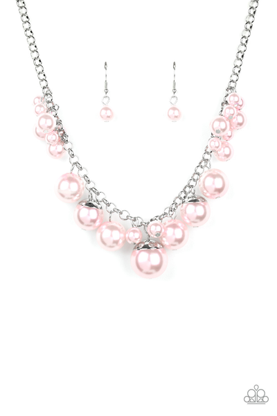 Capped in shiny silver fittings, oversized pearly pink beads and a collection of classic pink pearls swing from the bottom of a shimmery silver chain, creating a bubbly fringe below the collar. Features an adjustable clasp closure.