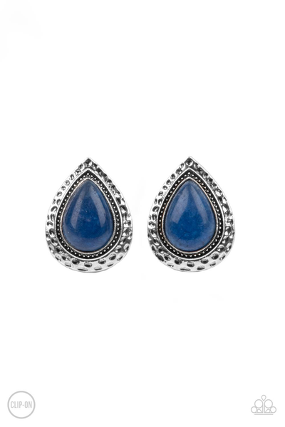 A teardrop lapis lazuli stone is pressed into the center of a hammered silver frame, creating a rustic display. Earring attaches to a standard clip-on fitting.