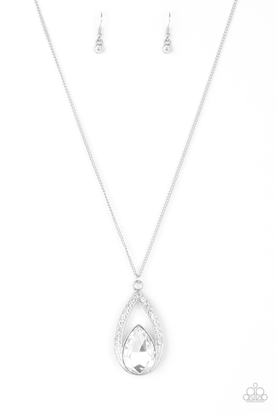 A glittery white teardrop gem is pressed into a silver frame radiating with glassy white rhinestones. The glamorous pendant swings from the bottom of a shimmery silver chain for a refined look. Features an adjustable clasp closure.