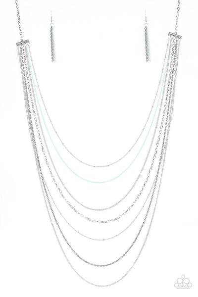 Mismatched silver chains alternate with dainty gray and green chains down the chest, creating a colorful industrial look. Features an adjustable clasp closure.