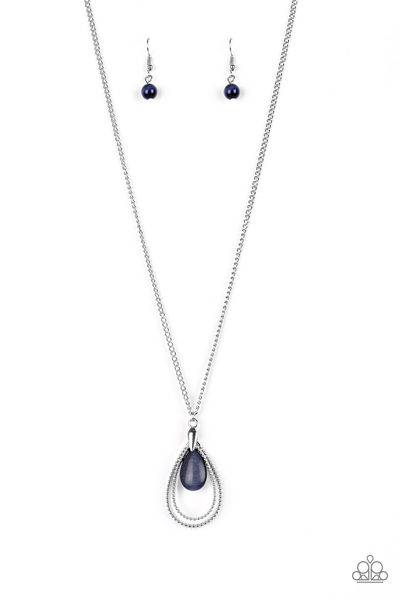 Studded silver teardrops swing from the bottom of a shimmery silver chain. A glowing blue moonstone attaches to the innermost frame, creating a whimsical pendant. Features an adjustable clasp closure.