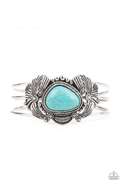 An asymmetrical turquoise stone is pressed into the center of a rustic silver centerpiece stacked with flared silver frames, shiny studs, and antiqued floral accents. The whimsical frames sit atop a layered cuff, creating a seasonal display around the wrist.