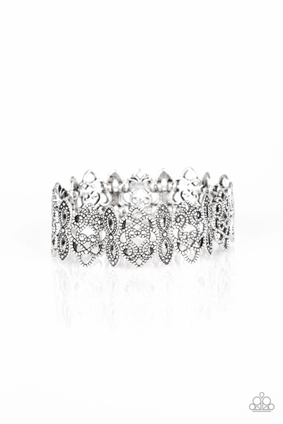 Radiating with studded detail, ornate silver filigree frames are threaded along stretchy bands around the wrist for a whimsical look.