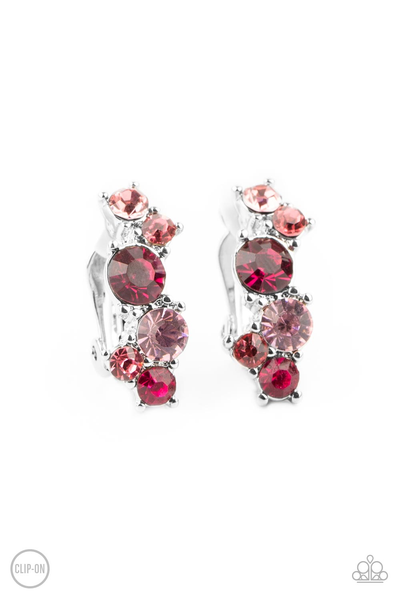 Varying in shades of pink, mismatched rhinestones delicately coalesce into a dainty frame for a colorfully sparkly display. Earring attaches to a standard clip-on fitting.