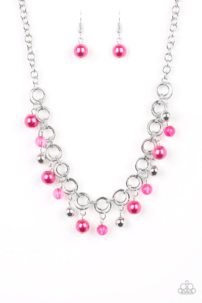 Featuring pearly and glassy finishes, an array of silver and pink beads swing from a double-linked silver chain, creating a fancy fringe below the collar. Features an adjustable clasp closure.