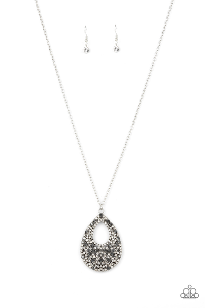 A sparkly explosion of glassy white and smoky hematite rhinestones haphazardly coalesce into a teardrop frame at the bottom of a lengthened silver chain, creating a twinkly pendant. Features an adjustable clasp closure.