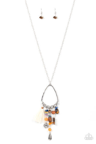 Infused with a multicolored collection of natural stone beads and pebbles, stacks of textured silver charms and mismatched wooden beads create earthy tassels at the bottom of a silver beaded teardrop frame. Enhanced with a shiny white threaded tassel, the whimsical fringe swings from the bottom of an extended silver chain for a seasonal finish. Features an adjustable clasp closure.