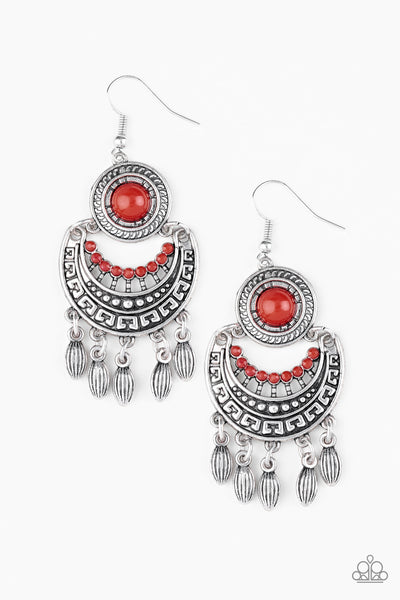 Dotted with a shiny red beaded center, a round silver frame gives way to an ornate silver crescent. Dainty silver beads swing from the bottom of the stacked frames, adding a whimsical fringe to the tribal inspired lure. Earring attaches to a standard fishhook fitting.