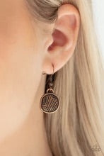Featuring a patchwork of linear textures, asymmetrical copper circular frames link below the collar for a bold metallic look. Features an adjustable clasp closure.
