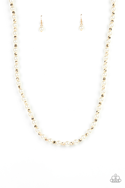 Classic white pearls and faceted gold beads alternate along an invisible wire below the collar, creating a timeless twist. Features an adjustable clasp closure.