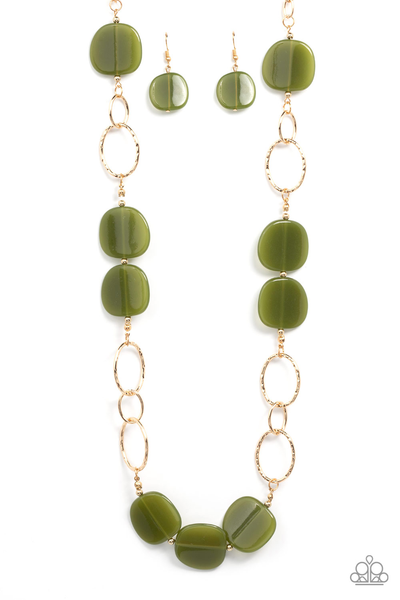 An oversized collection of Olive Branch acrylic accents adorn sections of oversized textured gold links, resulting in a refined pop of color across the chest. Features an adjustable clasp closure.