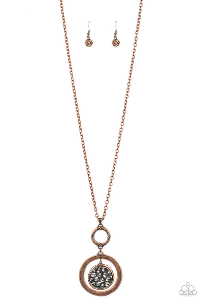 Bordered in an asymmetrical copper frame, a hammered silver disc swings from the top of an imperfect hoop that links to a studded copper ring, creating an authentically artisan pendant at the bottom of an antiqued copper chain. Features an adjustable clasp closure.