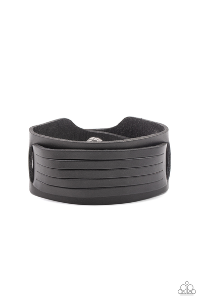 Spliced into layers, a black leather band is threaded through the center of a larger black leather band and studded in place for a rustic finish. Features an adjustable snap closure.