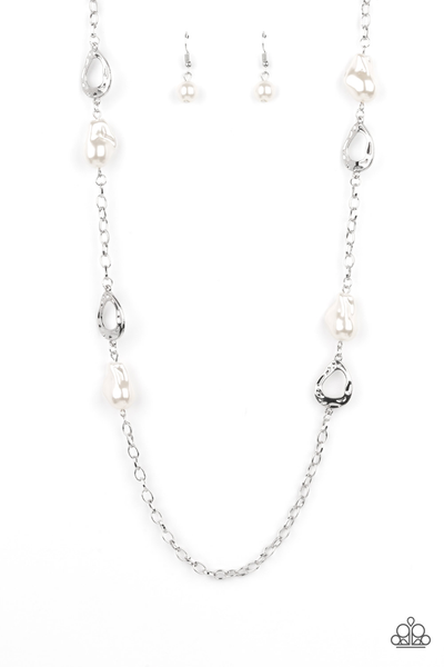 Asymmetrical hammered silver frames and imperfect pearly accents link with sections of classic silver chains across the chest, creating a rustic and refined statement piece. Features an adjustable clasp closure.
