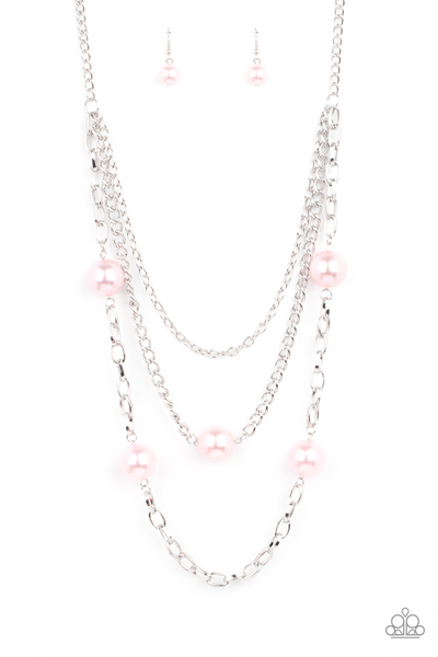 Haphazardly dotted with oversized pearly pink beads, three strands of mismatched silver chain boldly layer down the chest for a timeless finish. Features an adjustable clasp closure.