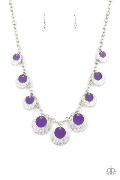 A stunning array of sparkling textured silver discs layered with Amethyst Orchid accent discs, fans out across the collar for a show-stopping cosmic display. Features an adjustable clasp closure.