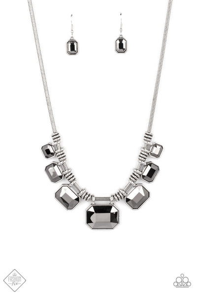 Featuring regal emerald cuts, smoky hematite rhinestones gradually increase in size as they glide along a rounded silver snake chain below the collar. Separated by stacks of silver rings, the smoldering rhinestones are encased in sleek silver frames for a glamorously gritty finish. Features an adjustable clasp closure.