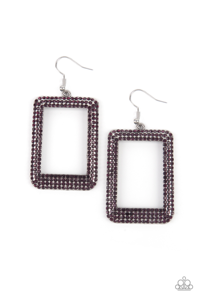 Bordered in rows of glittery purple rhinestones, an oversized silver rectangular frame swings from the ear for a fashionable finish. Earring attaches to a standard fishhook fitting.